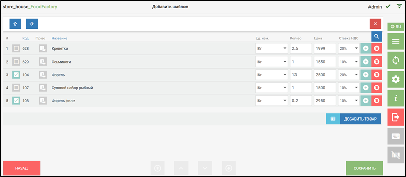 Если в шаблоне важен порядок следования товаров, а в процессе работы товары были указаны в неверном порядке, то порядок следования можно изменить. Изменить порядок следования товаров можно при создании нового шаблона или при редактировании ранее созданного шаблона. Для этого необходимо выставить флаг в строке с нужным товаром. При выделении товара в верхней части окна появляются кнопки Вверх/Вниз