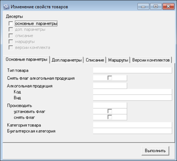 Чтобы установить/изменить для группы товаров такие характеристики, как Основные параметры, Доп. параметры, Списание, Маршруты и/или наличие флага «алкогольная продукция», выполните следующие действия: