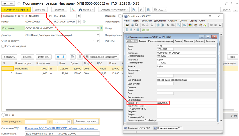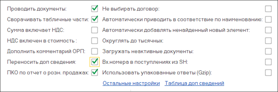 Флаг «Вх. Номера в поступлениях из SH». Если флаг выставлен, в документ 1С «Поступление товара» во входящий номер загружается номер документа r_k StoreHouse Pro. Если флаг отсутствует, в документ 1С «Поступление товара» во входящий номер загружается значение из поля «Номер ТТН» в документе r_k StoreHouse Pro. При незаполненном поле «Номер ТТН» в документе r_k StoreHouse Pro, во входящий номер документа 1С загружается номер документа r_k StoreHouse Pro.