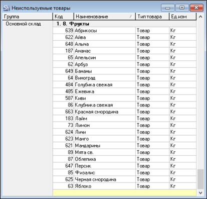 Представлен отчет «Неиспользуемые товары» сгруппированный по Товарным группам и по подразделениям.