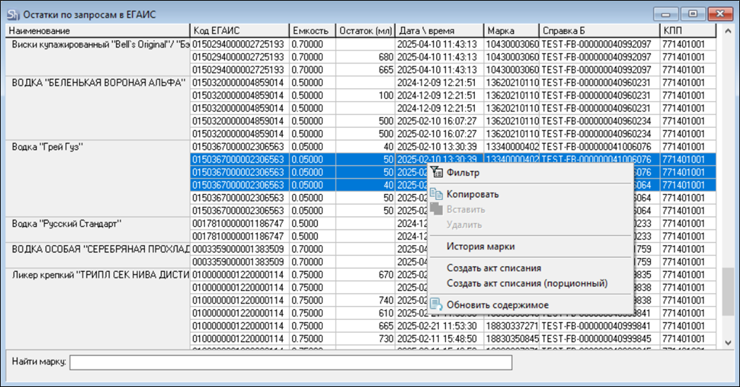 Из отчета «Остатки по запросам в ЕГАИС» есть возможность создать Акт списания и Акт списания (порционный). Для этого выделите необходимые позиции, удерживая клавишу [Ctrl], и воспользуйтесь соответствующим пунктом контекстного меню «Создать акт списания» или «Создать акт списания (порционный)».