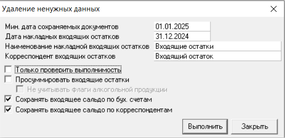 Сохранять входящее сальдо по корреспондентам - при включенной настройке, при удалении данных будет сохраняться входящее сальдо по корреспондентам. При выключенной настройке входящие остатки будут формироваться только по товарам (количество и сумма) по накладным.