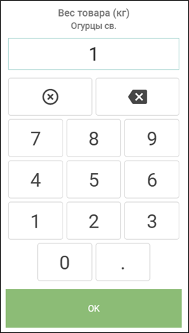 При включенном флаге «Ввод веса без подключения весов» вес товара вводится вручную. После выбора товара откроется окно ввода веса товара.
