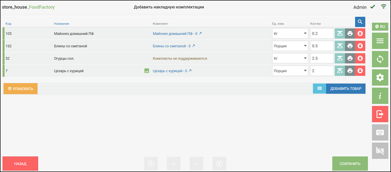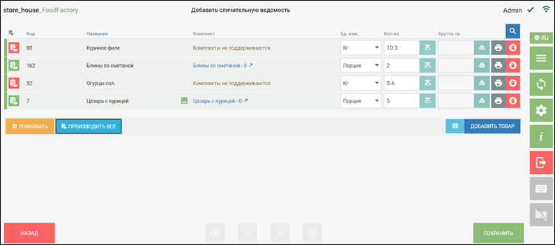 С версии FoodFactory 1.0.12-4 добавлена возможность просмотра комплектов из документа Комплектация и Сличительная ведомость.