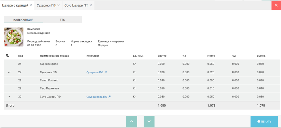 . При просмотре комплекта, для товаров с прикрепленной картинкой, на закладке Калькуляция будет выведено изображение товара. Если к товару – полуфабрикату прикреплена картинка, для него тоже будет выведено изображение в комплекте.