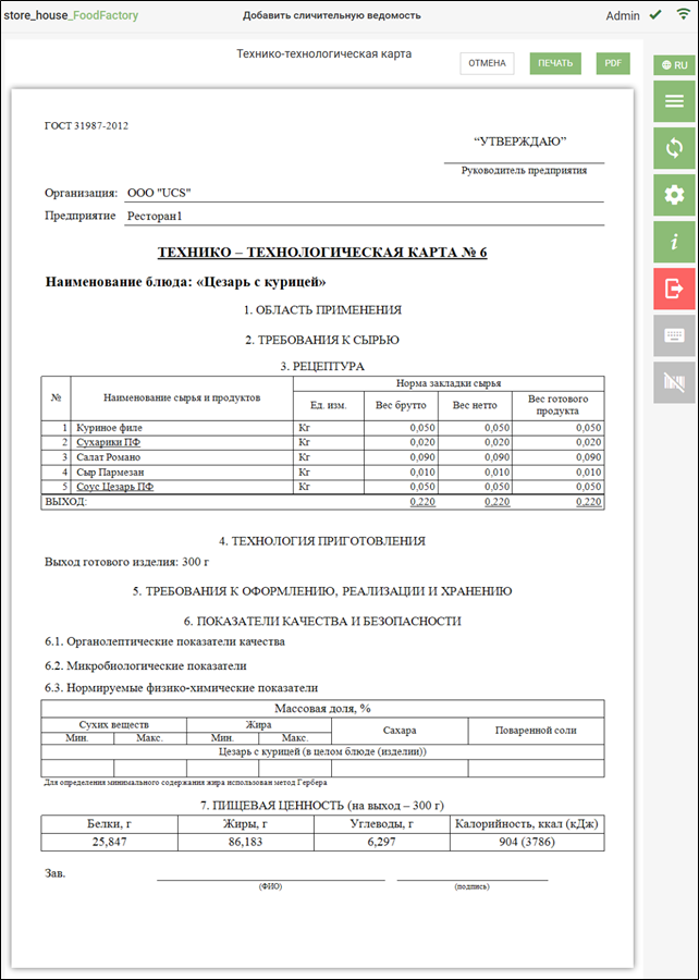 Для печати комплекта необходимо нажать кнопку [Печать]. Откроется предварительный просмотр Технико -Технологической карты. В окне просмотра печатной формы документа его можно распечатать нажав на клавишу [Печать]. Документ распечатается на принтере указанном в настройках печати принтеров для накладных. Так же документ можно открыть в формате PDF.