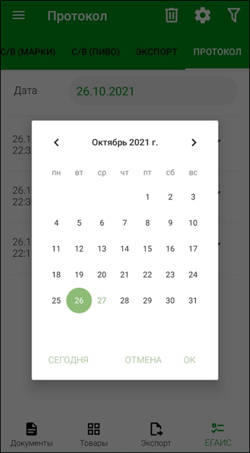 При загрузке списка протоколов автоматически устанавливается текущая дата. При необходимости следует установить другой день, выбрав нужную дату из открывающегося календаря, и затем нажать кнопку ОК.