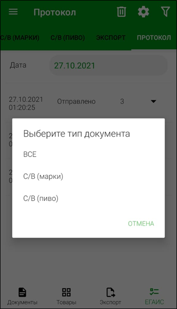 Для фильтрации документов можно воспользоваться кнопкой и в открывшемся списке выбрать какие документы нужно отображать в протоколах: ВСЕ, С/В(МАРКИ) или С/В(ПИВО).