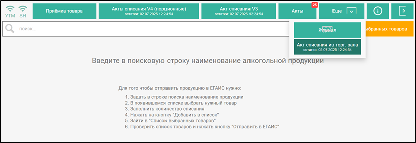 При выборе «ЕГАИС» открывается доступ к 6-ти функциям приложения: «Приемка товара» (только для r_k SH Pro), «Акт списания V3», «Акт списания V4», «Документы ЕГАИС», «Журнал учета объема розничной продажи алкогольной продукции» и «Акт списания из торг. зала».