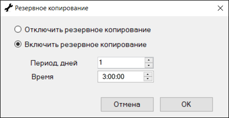 Включить резервное копирование – данная настройка включает резервное копирование базы данных и необходимо задать следующие параметры: