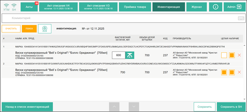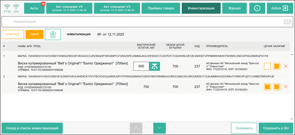 Документ инвентаризация можно сохранить в базе EgaisForPos и в базе r_k SH Pro. При сохранении документа в базу r_k SH Pro, ему присваивается номер и уже в r_k SH Pro можно сверять остатки целых и порционных марок маркируемой алкогольной продукции, сохраненные в базе r_k StoreHouse Pro с реальными остатками марок на предприятии.