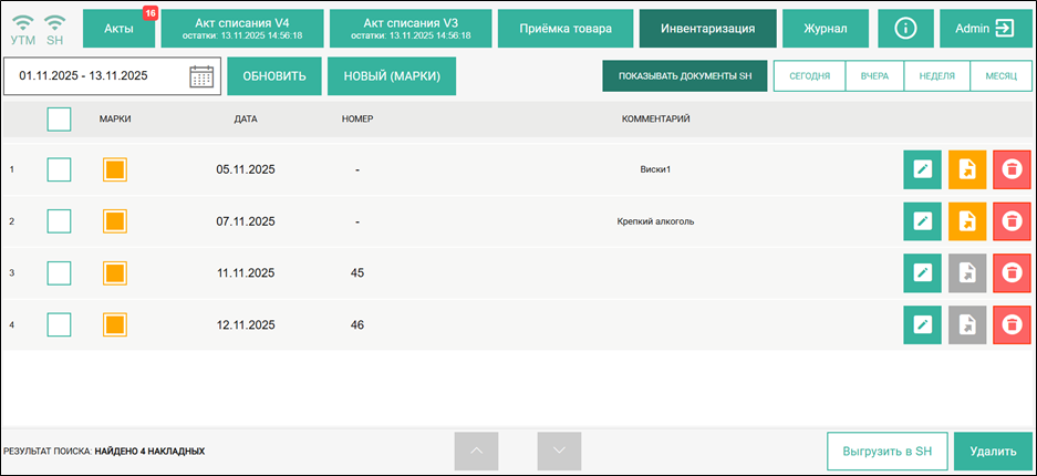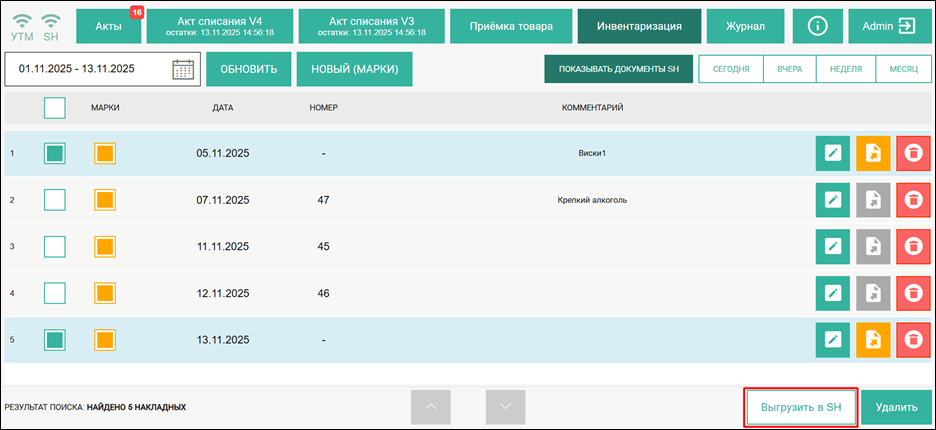 Из списка Инвентаризация можно выгрузить несколько документов в базу r_k SH Pro. Для этого выделите зеленым маркером документы и нажмите на кнопку [Выгрузить в SH]. Для выгруженных документов в базу r_k SH Pro кнопка выгрузки станет неактивной (серой)
