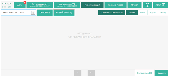 Для добавления нового документа для маркируемой продукции нажмите на кнопку [НОВЫЙ (МАРКИ)] на Закладке Инвентаризация.