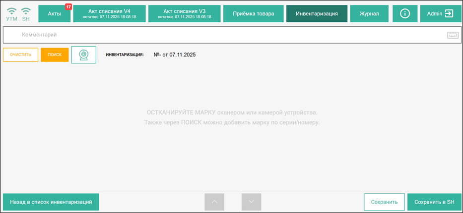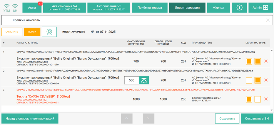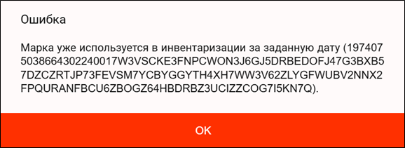 Инвентаризацию можно проводить отдельно по кодам видов алкогольной продукции и за один день могут быть заведены несколько документов инвентаризации. В системе осуществляется проверка, что за одну дату в разных документах инвентаризации, сохраненных и несохраненных в базу в базу r_k SH Pro по FSRAR_ID не используется одинаковая марка. Если отсканированная марка находится в одном из документов инвентаризации за заданную дату, выйдет сообщение «Марка уже используется в одном из неотправленных документов за эту дату» или «Марка уже используется в инвентаризации за заданную дату» и отсканированная марка не будет добавлена в документ инвентаризации.