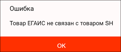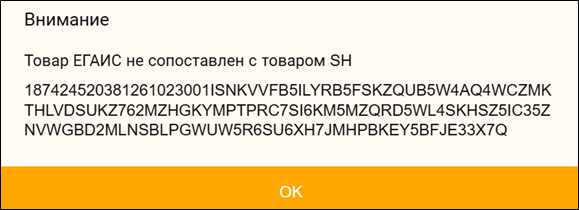 При сканировании Целой марки, для которой товар ЕГАИС не сопоставлен с товаром r_k SH Pro, система выдаст предупреждение «Товар ЕГАИС не сопоставлен с товаром SH».