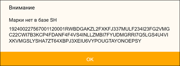 При сканировании марки, отсутствующей в базе r_k SH Pro на остатках по данному FSRAR_ID, система выдаст предупреждение «Марки нет в базе SH».