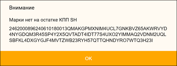 Если марка была на остатках данного КПП, но была списана расходными документами ЕГАИС (возврат товара, перемещение, акт списания), при сканировании выйдет всплывающее сообщение «Марки нет на остатке КПП SH».