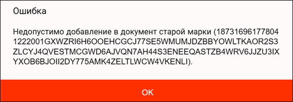 При сканировании марки, которая находится в списке «Вскрытых марок» с флагом «Старая» выйдет сообщение «Недопустимо добавление в документ старой марки». «Старые марки» в инвентаризация не участвуют.