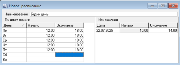 Расписание составляется По дням недели. Для каждого дня недели необходимо указать время начала и окончания действия расписания.