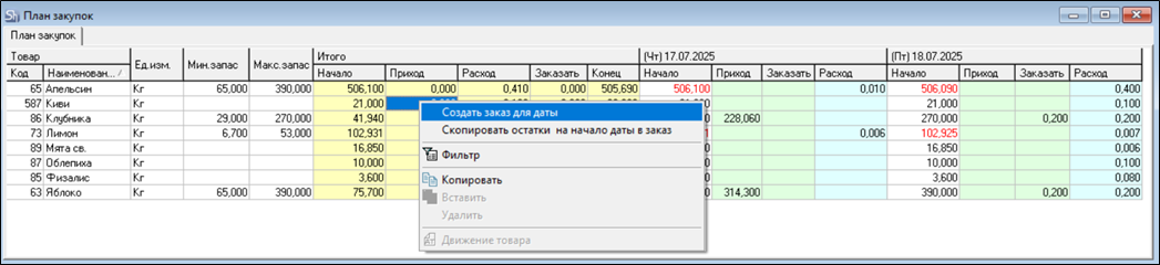 - Позиционируйте курсор на дату отчета, на которую требуется создать заказ и воспользуйтесь пункт контекстного меню «Создать заказ для даты», если хотите скопировать в заказ товары из колонки «Заказать»;