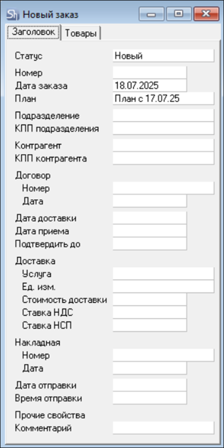 На странице «Заголовок» заказа будет автоматически определена «Дата заказа» и «Заголовок плана», для которого создается заказ.