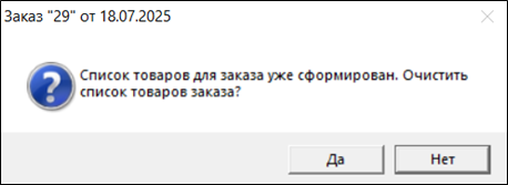 Для заполнения параметров заказа на заголовке можно выбрать договор. При выборе договора на заголовке заказа, выйдет сообщение «Список товаров для заказа уже сформирован. Очистить список товаров заказа?».