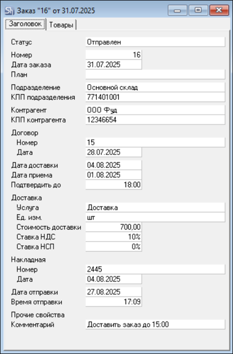 Параметры раздела Доставка (наименование Услуги, Стоимость доставки, Ставка НДС/НСП) заполняются на основе выбранного договора. Значения можно переопределить на заказе вручную.