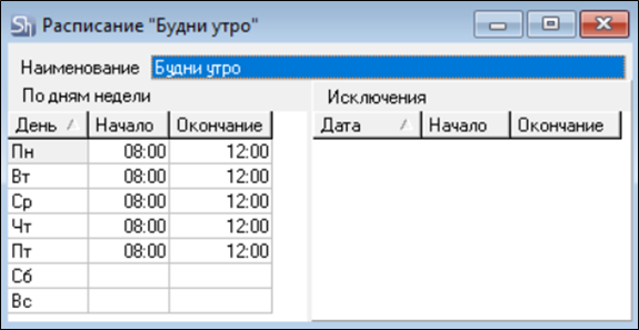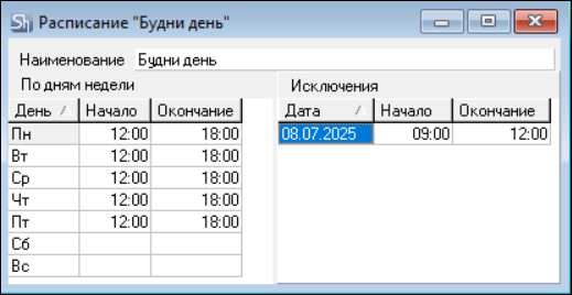 Дата приема + Подтвердить до - рассчитывается ближайшая дата по расписанию заказа с учетом возможных исключений. Дата создания заказа не учитывается, расчет со следующей даты. Дата создания заказа 31.07.2025 – это четверг. Исходя из расписания Дата приема будет в пятницу 01.08.2025. Подтвердить до – время в поле Окончание у пятницы – 18:00.