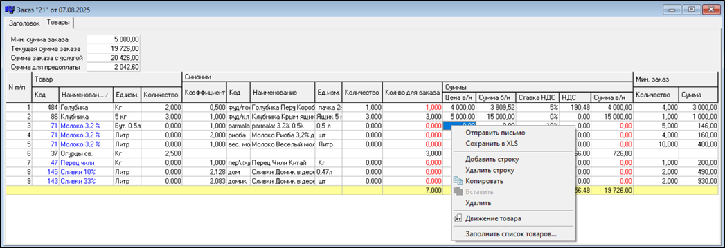 После заполнения списка товаров на основе договора, можно добавлять товары вручную, использую метод выбора товара из словаря или выбор товара по синониму, редактировать количество.