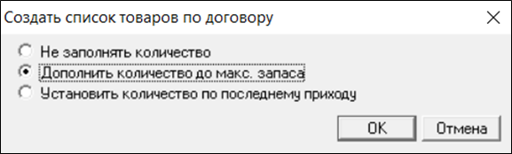 Установить количество по последнему приходу - список товаров заполняется товарами, определенными в договоре на закладке «Товары для заказа». Количество заполняется по последнему приходу от поставщика, заполненного на заголовке заказа.