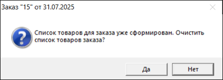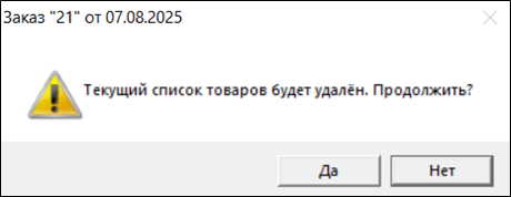 Если перед вызовом команды «Заполнить список товаров» список товаров в заказе был заполнен, то после выбора нового правила выйдет сообщение «Текущий список товаров будет удален. Продолжить?». Нажмите [Да] для заполнения списка товаров по новому правилу. При выборе [Нет] новое выбранное правило не применится, список товаров останется без изменений.