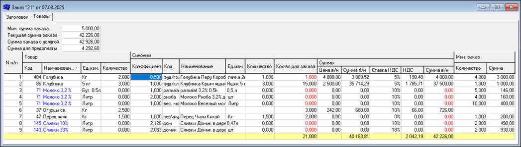 Если заказ формируется в номенклатуре поставщика, то «Количество для заказа» формируется на основе поля «Синоним – Количество» в единицах измерения поставщика «Синонимы – Ед. изм.».