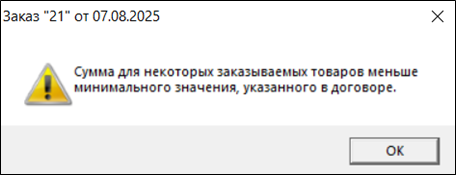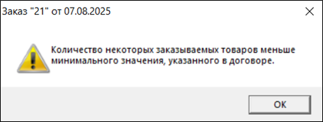 Красным шрифтом подсвечиваются значения, которые меньше значений в полях Мин. количество для заказа и Мин. сумма для заказа. Сохранить такой заказ можно, но при сохранении выйдет предупреждающее сообщение.