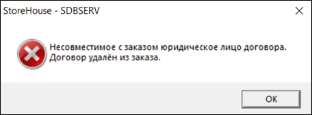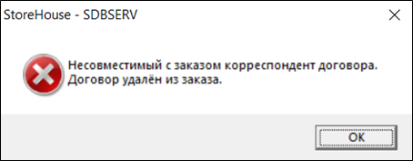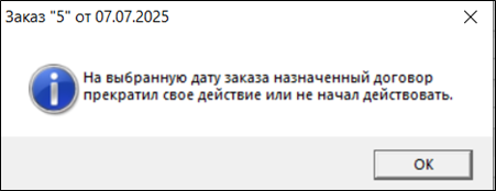- Если при изменении Даты заказа выбранный договор прекращает свое действие на выбранную дату, система выдаст предупреждение. Пользователь сам решает нужно ли перевыбрать действующий договор или оставить "закончившейся".