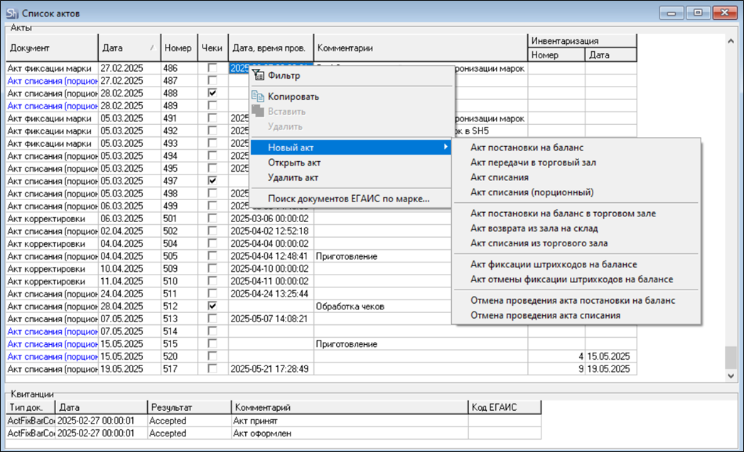 Для работы с актами ЕГАИС воспользуйтесь пунктом меню «ЕГАИС» - «Акты» главного пункта меню «Сервис».