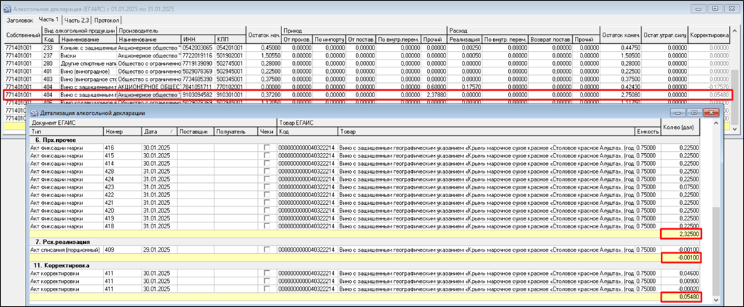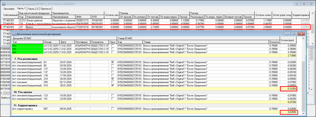 По данным Акта корректировки получено положительное значение «0,02500 Дал». Это количество вычитается из Расхода Реализации «0,10250 Дал». В результате в Алкогольной декларации (ЕГАИС) в поле Реализация видим значение «0,07750 Дал».