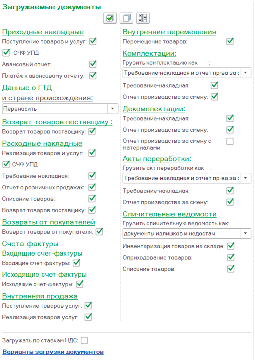 Для фильтрации загрузки документов необходимо в поле «Загружаемые документы» флагами выбрать типы загружаемых документов 1С.