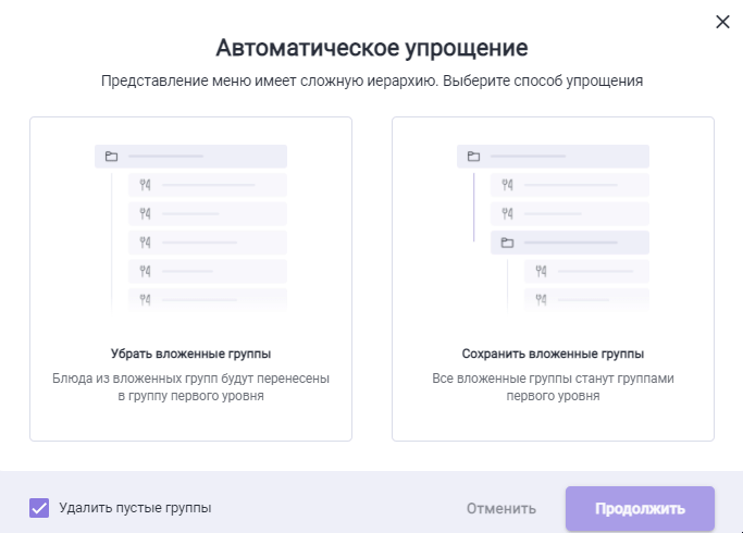 - При нажатии на левый вариант все блюда из вложенных групп будут опубликованы в одной группе первого уровня