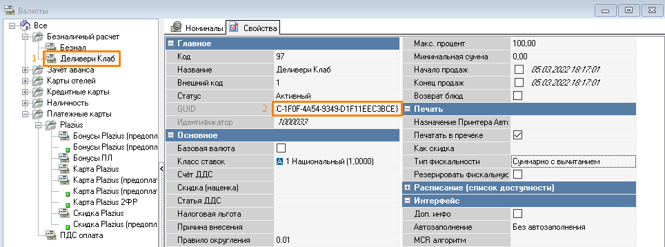 - Перейдите в раздел Валюта, оплата. Добавьте нужную валюту, указав GUID валют.