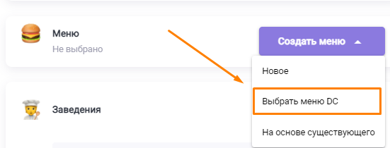 Для интеграции можно выбрать существующее меню DC. Эта опция позволяет не дублировать меню и использовать одно представление для нескольких заведений в корпорации. Меню необходимо настраивать на странице интеграции.