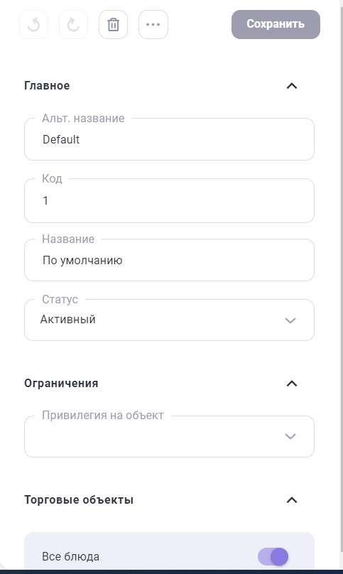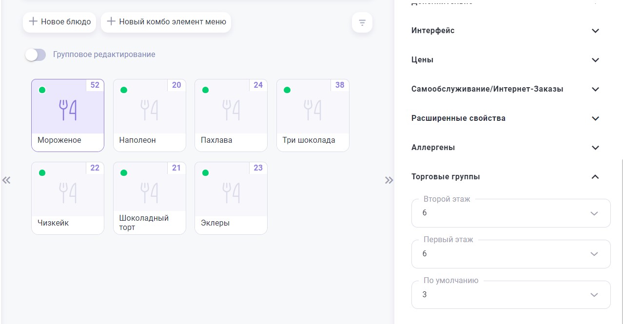 Другими словами, торговая группа — это множество, которое содержит нужные для использования в конкретных условиях: блюда, скидки, модификаторы, консуманты, типы заказа и валюты. Торговая группа действует в рамках пакета, в условиях, которые существовали на момент создания пакета.