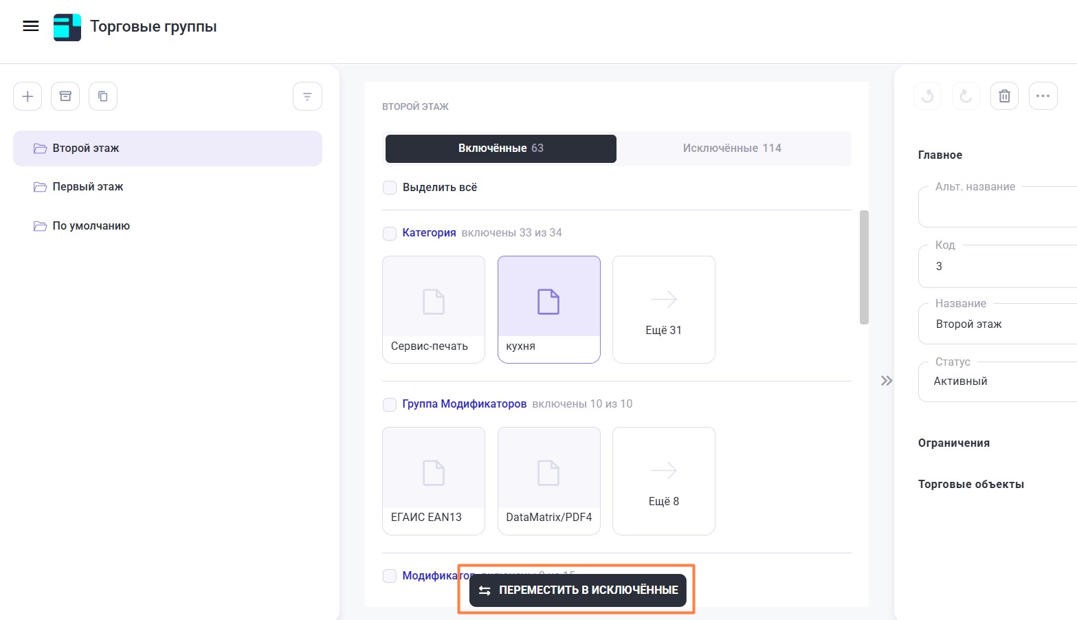 В торговой группе, во вкладке Включеные весь список объектов, для Исключения торгового объекта необходимо выделить его и нажать на кнопку Переместить в исключенные.