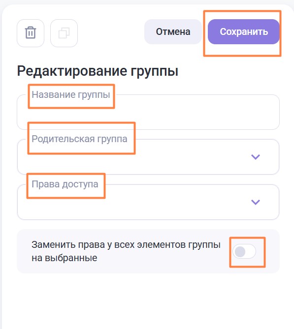 Чекбокс Заменить права у всех элементов группы на выбранные — при активации чекбокса все права доступа внутри группы будут перезаписаны, без активации чекбокса - добавлены.