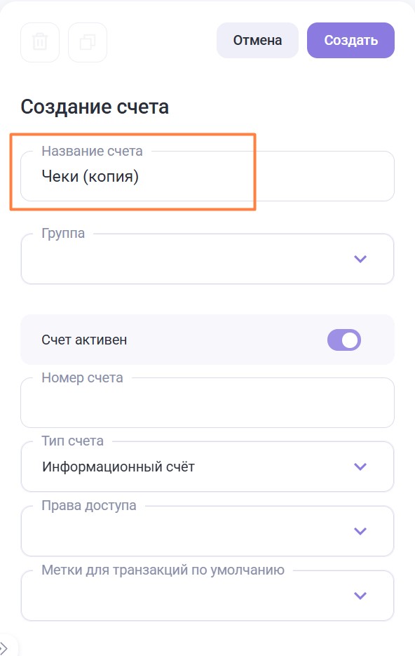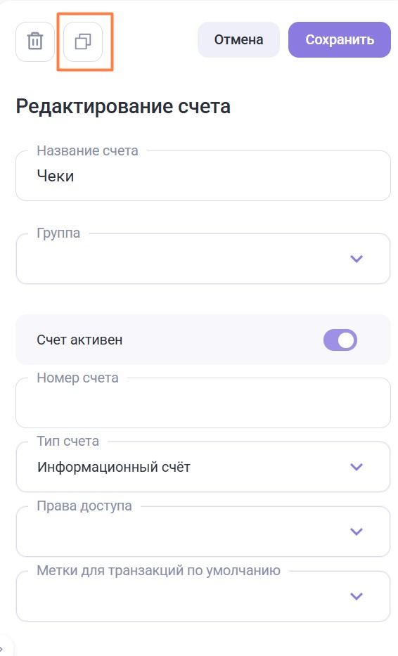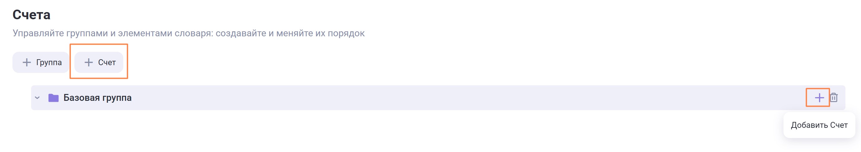 + Добавить элемент — используется для создания/редактирования/удаления элементов. Элементы — конкретные объекты (например счета, операции, метки, должности), которые хранятся внутри групп.
