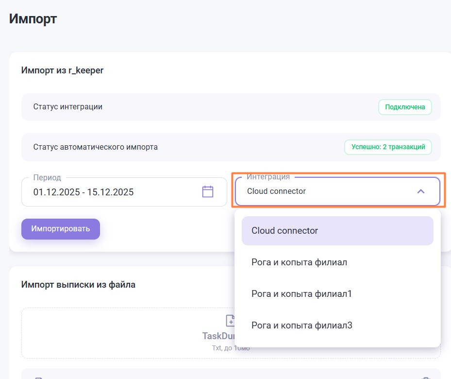 - Импорт из r_keeper — предназначен для загрузки данных о выручке и кассовых операциях ресторанов.