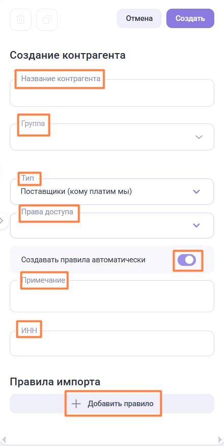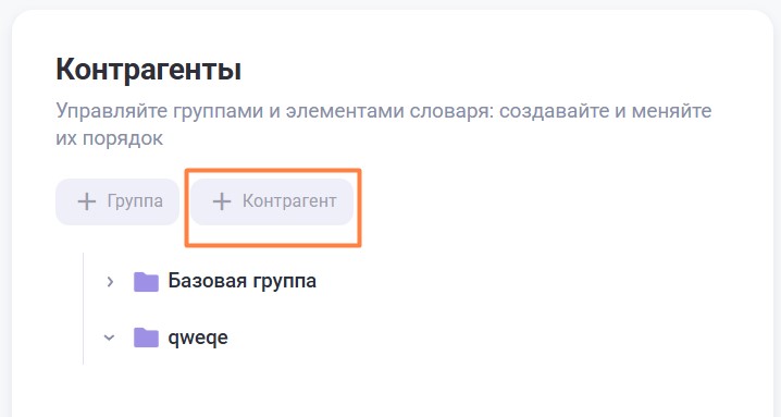 Контрагент может быть добавлен вручную или загружен при импорте.