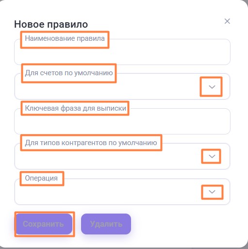 Добавить правило — возможность присвоить правило, которое будет выполняться при выгрузки выписки. Для создания правила отключите чекбокс Создавать правила автоматически и заполните следующие поля: