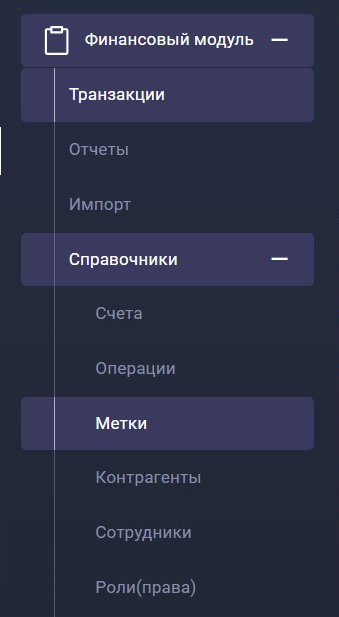 1. Зайдите в меню в раздел Финансовый модуль>Справочники>Метки