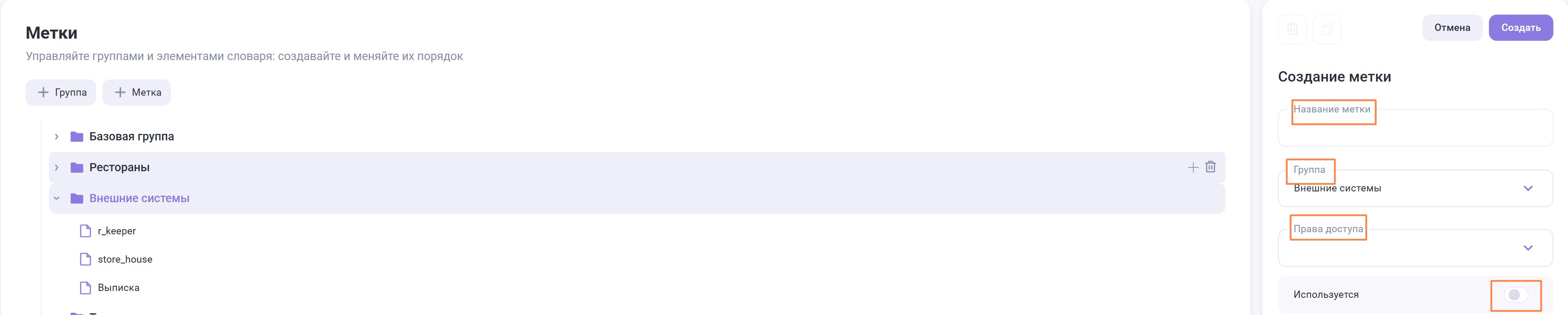 Метки это «теги», которые помогают группировать элементы, например в таблице транзакций или в отчетах. При создании новой метки она же добавляется в поле “Права доступа” и в права доступа роли пользователя. метка может быть добавлена вручную или загружена при импорте.