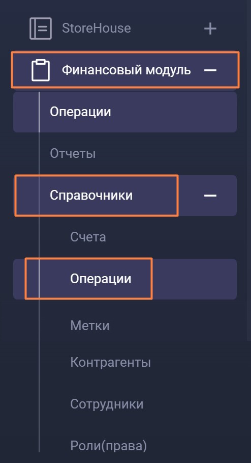 1. На главной панели зайдите в раздел меню Финансовый модуль>Справочники>Операции